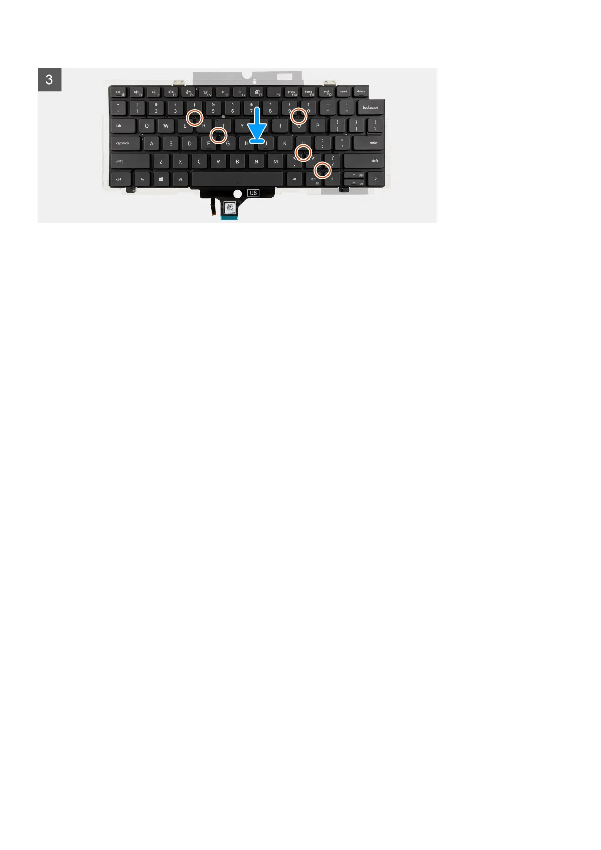 2. Replace the five (M2x2) screws to secure the keyboard to the keyboard bracket.