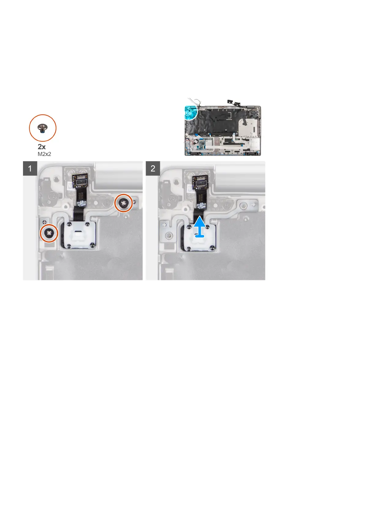 1. Remove the two screws (M2x2) that secure the power-button board to the palm-rest assembly.