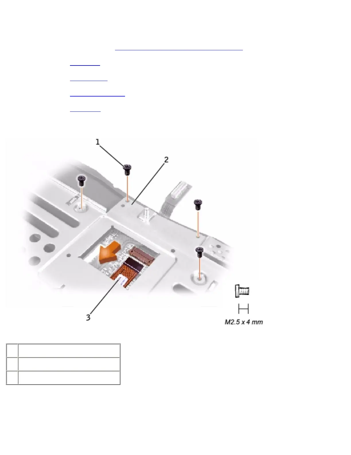7. Remove the four M2.5 x 4-mm screws that secure the palm rest bracket.