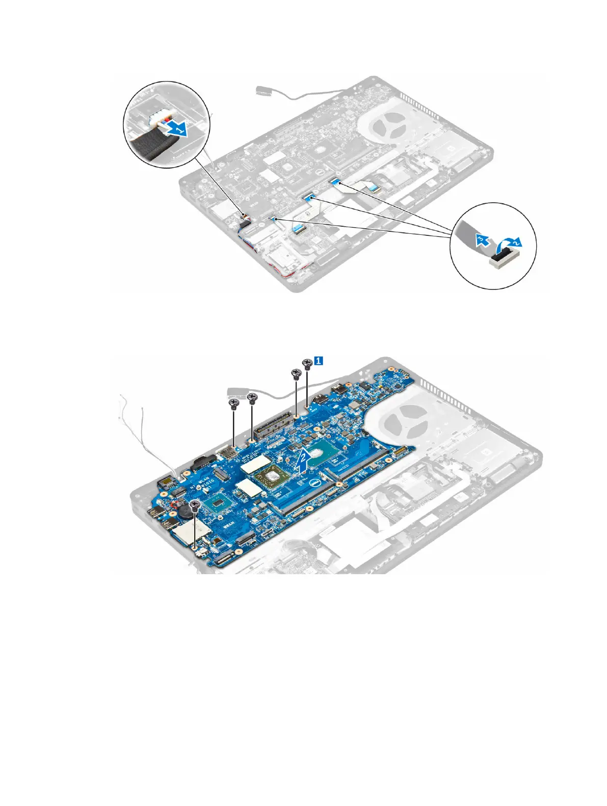 c. Lift the system board from the computer [2].