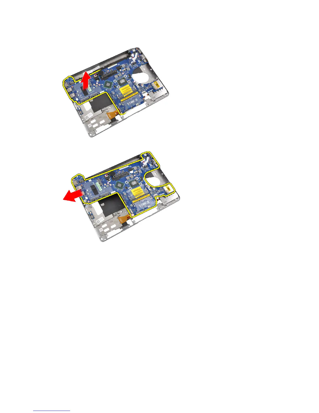 7. Lift the left edge of the system board and raise it to a 45-degree angle.