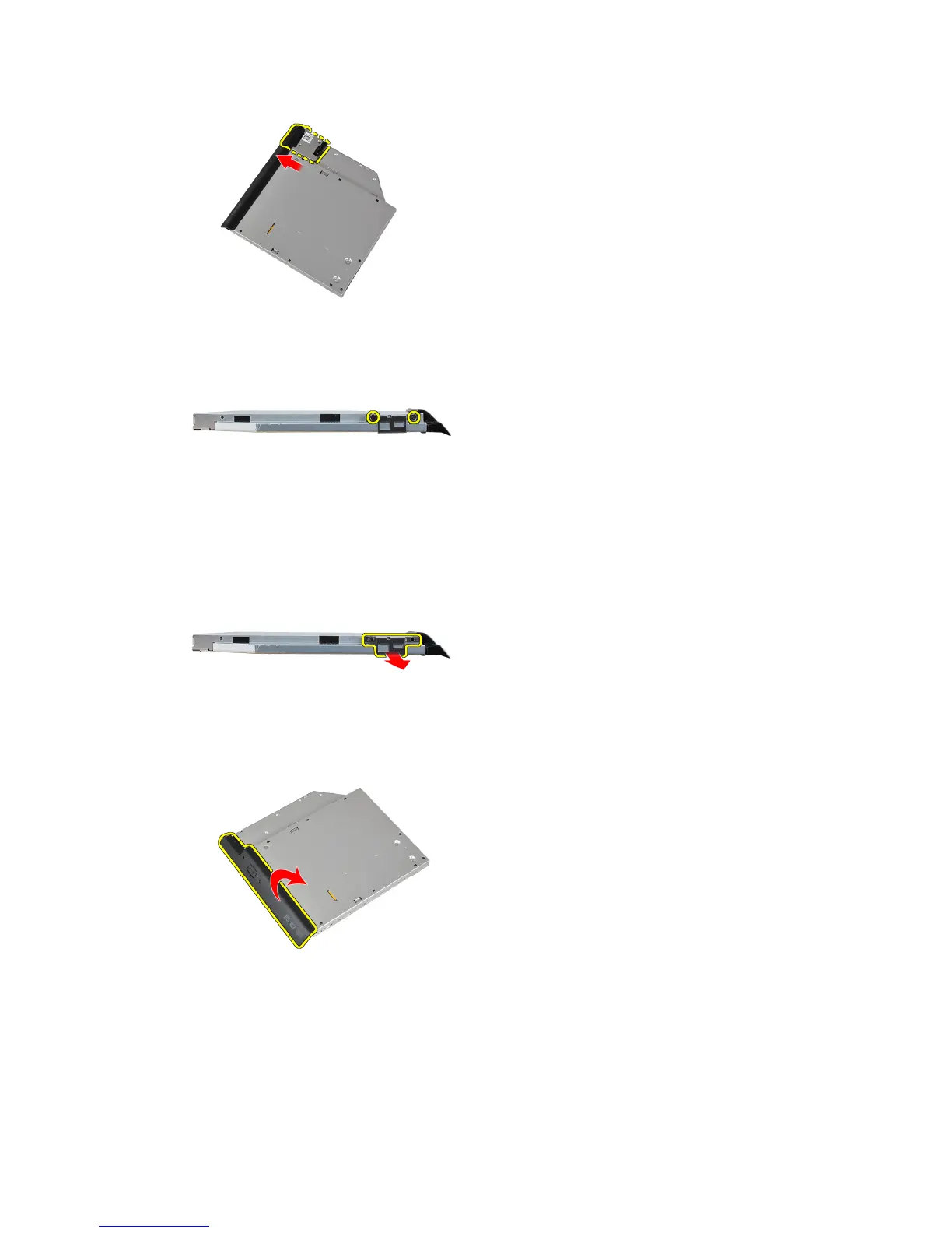 7. Remove the screws that secure the drive-latch bracket to the optical drive.