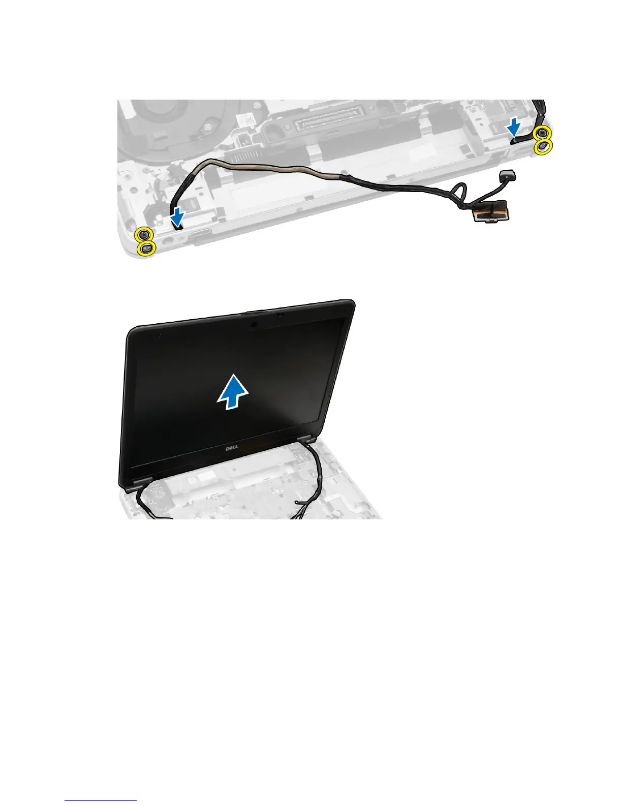 2. Route the LVDS cable and the camera cable through the routing channel. Tighten the screws to secure the display