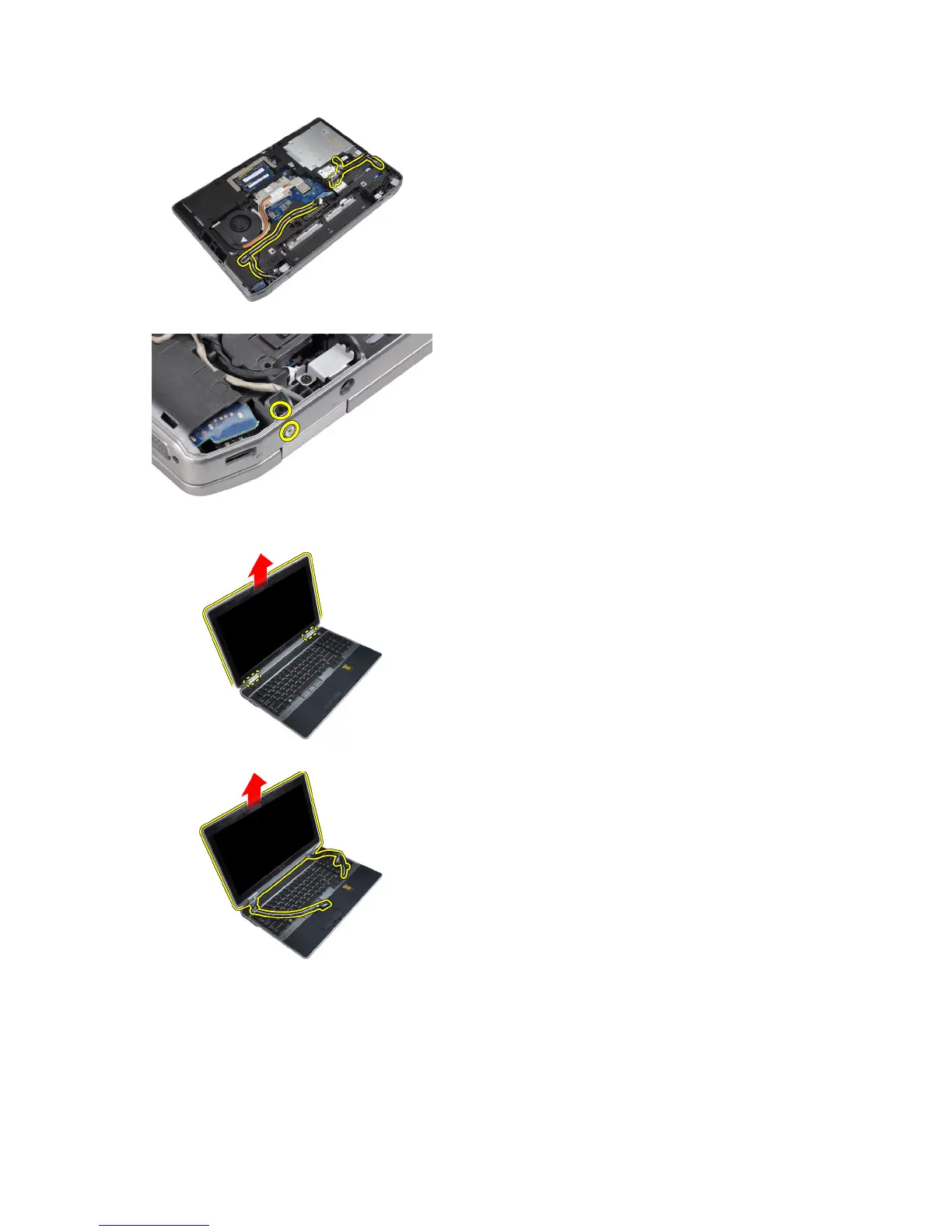 9. Lift the display assembly and pull the LVDS and the antenna cables through the opening of the computer.