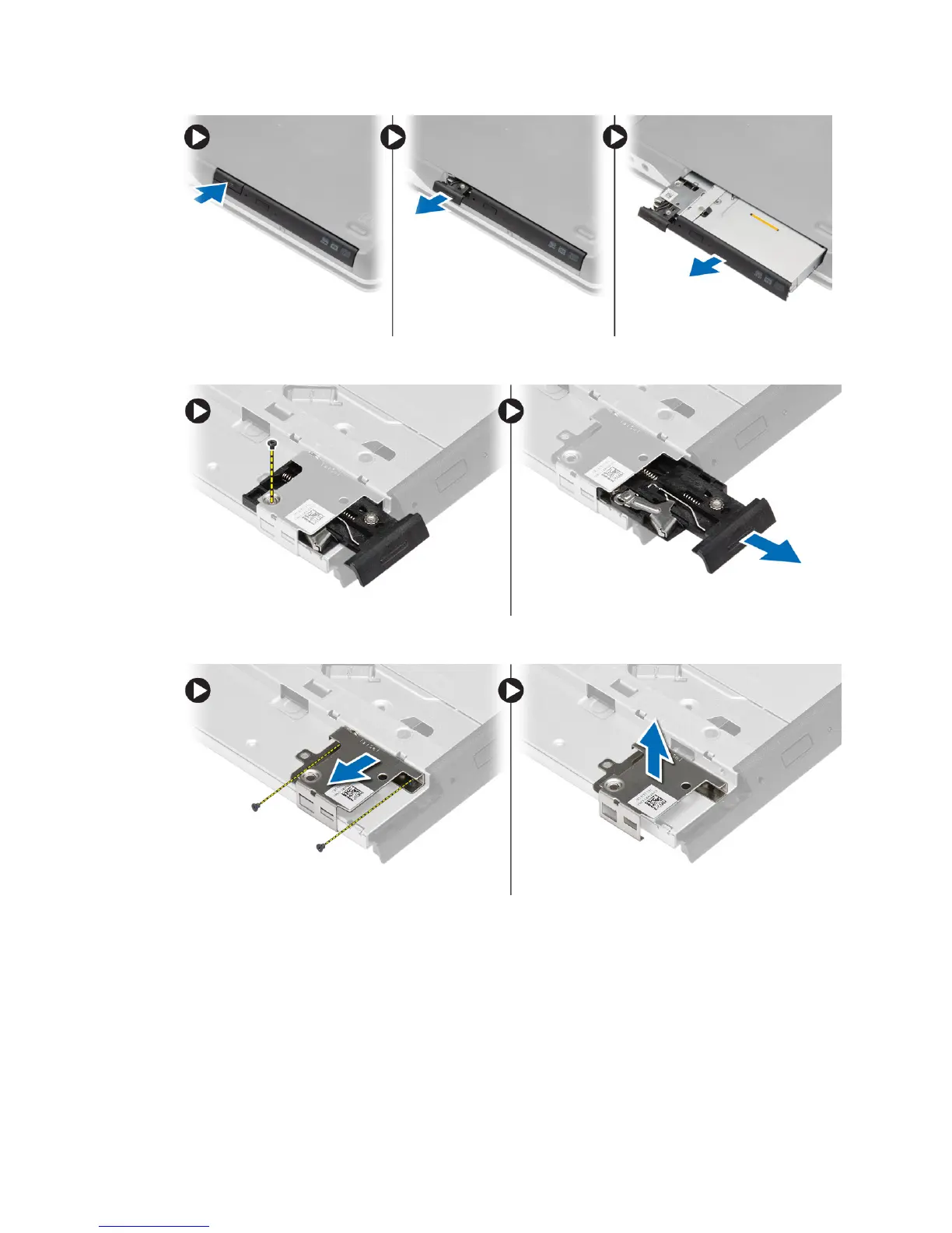 4. Remove the screw that secures the optical-drive latch to the optical drive. Slide the optical-drive latch and remove