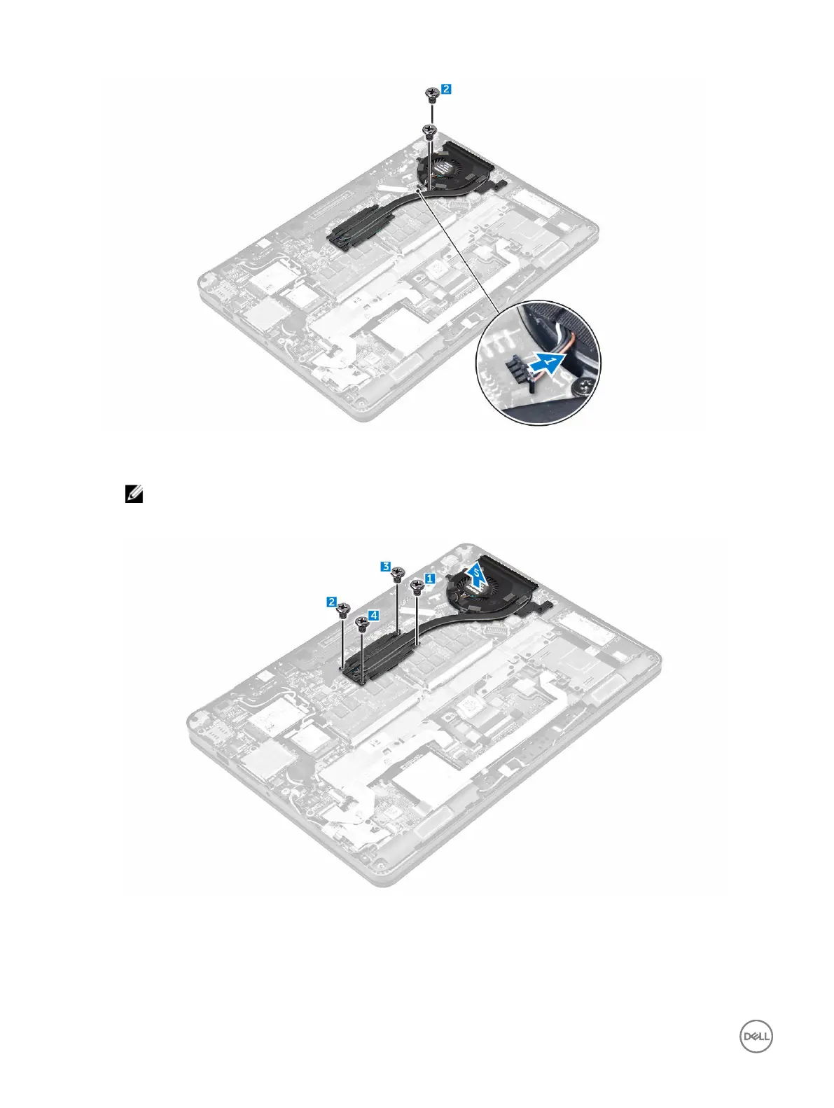 NOTE: Remove the screws that secure the heat sink to the system board in the order of the callouts shown [1,