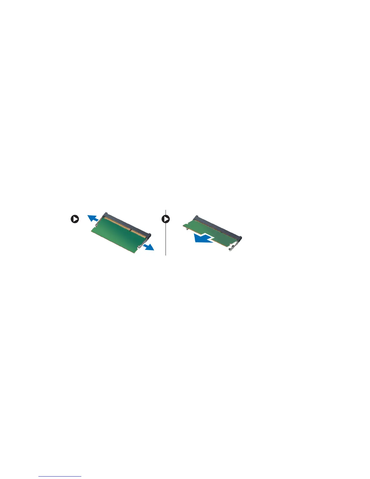 3. Pry the securing clips away from the memory module until it pops up. Remove the memory module from its