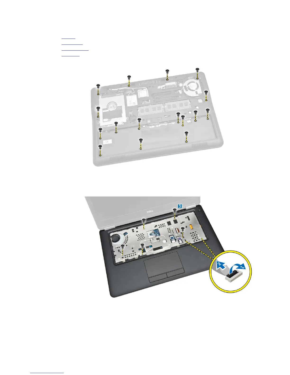 b. Disconnect touchpad and power LED cables from their connectors on the system board [1] [2].