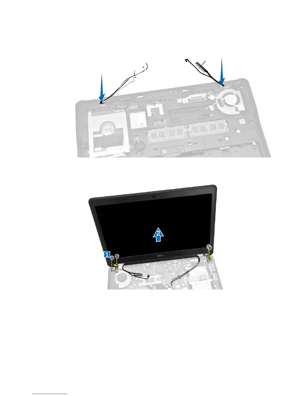 5. Pull the WLAN, WWAN and display-assembly cables from the holes on the base chassis that secure