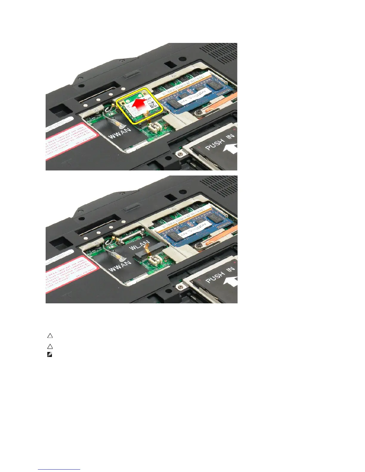 NOTE: The card slot will be marked by a WLAN silk-screen. Do not install the mini-card into any other card slot. If you are installing a WWAN card, install