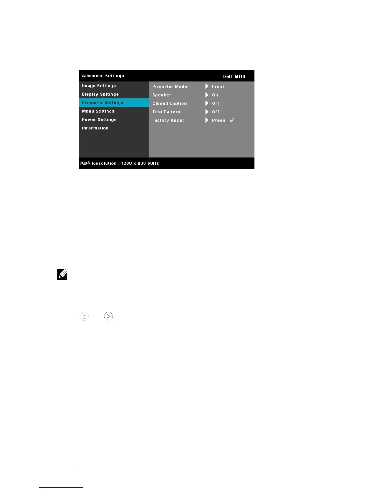projector settings menu provides the following options: