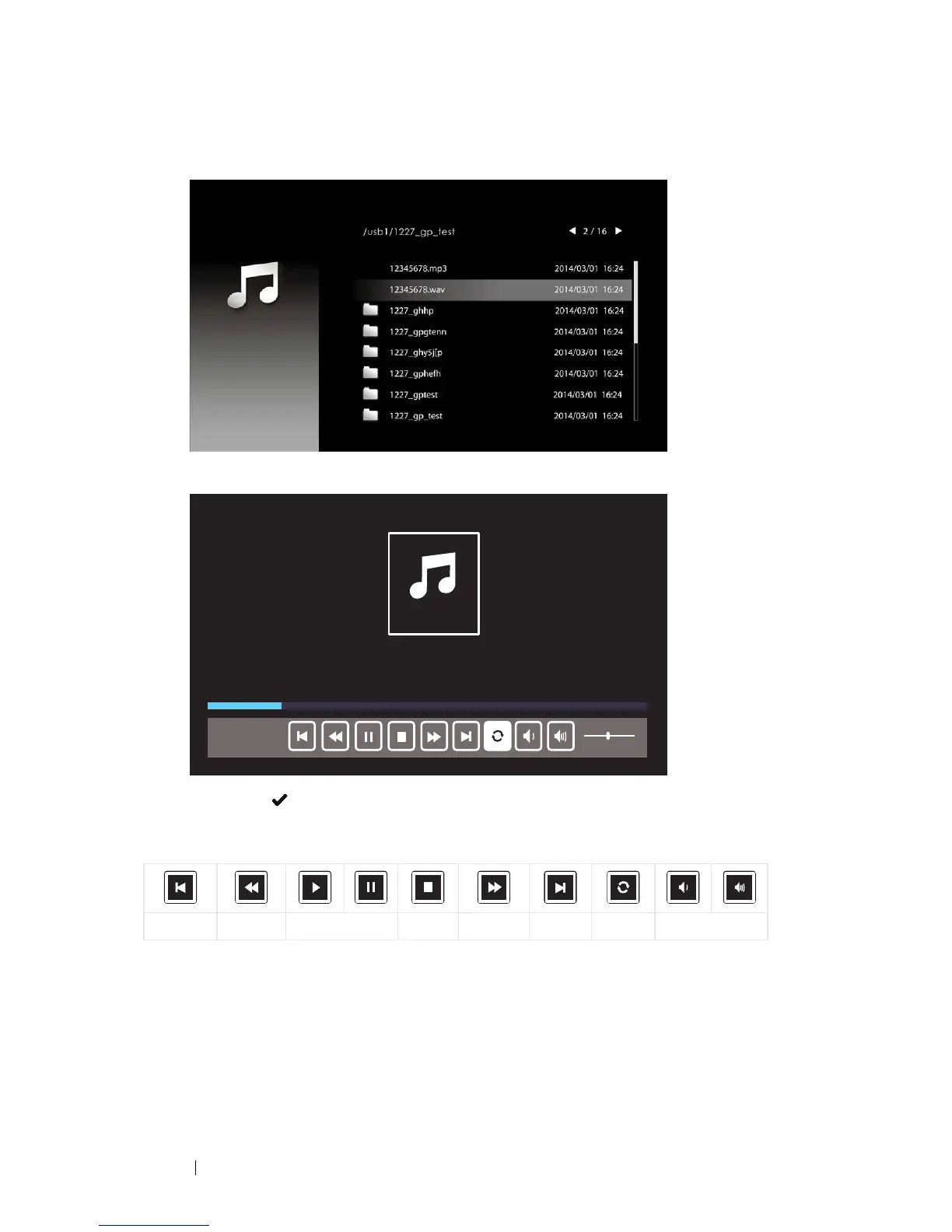 Previous Rewind Play / Pause Stop Forward Next Repeat Volume - / +