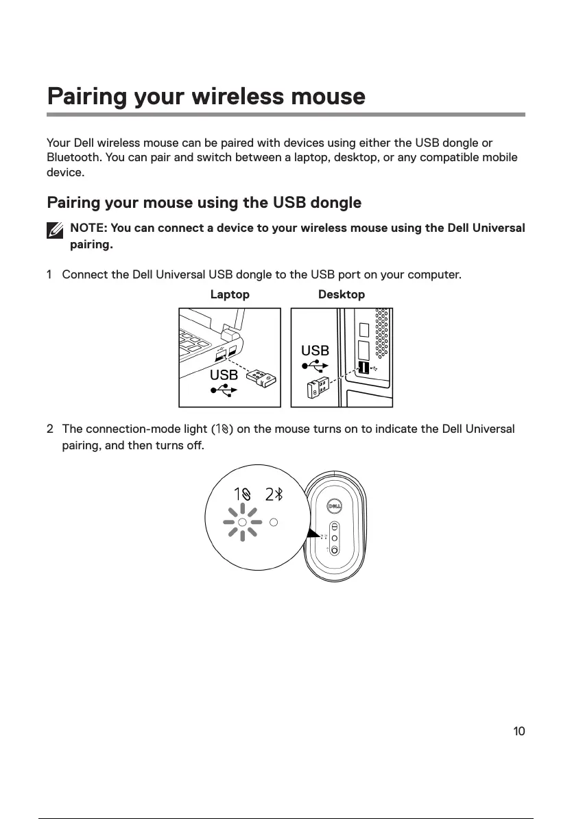 Your Dell wireless mouse can be paired with devices using either the USB dongle or