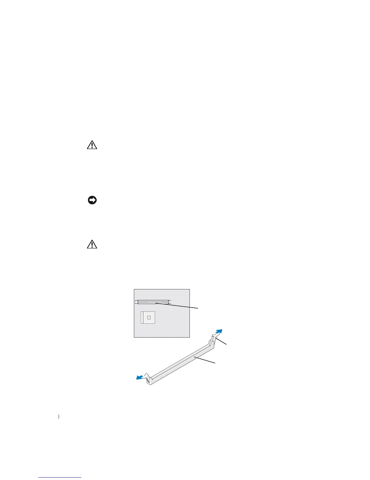 6 Press out the securing clip at each end of the memory module connector.