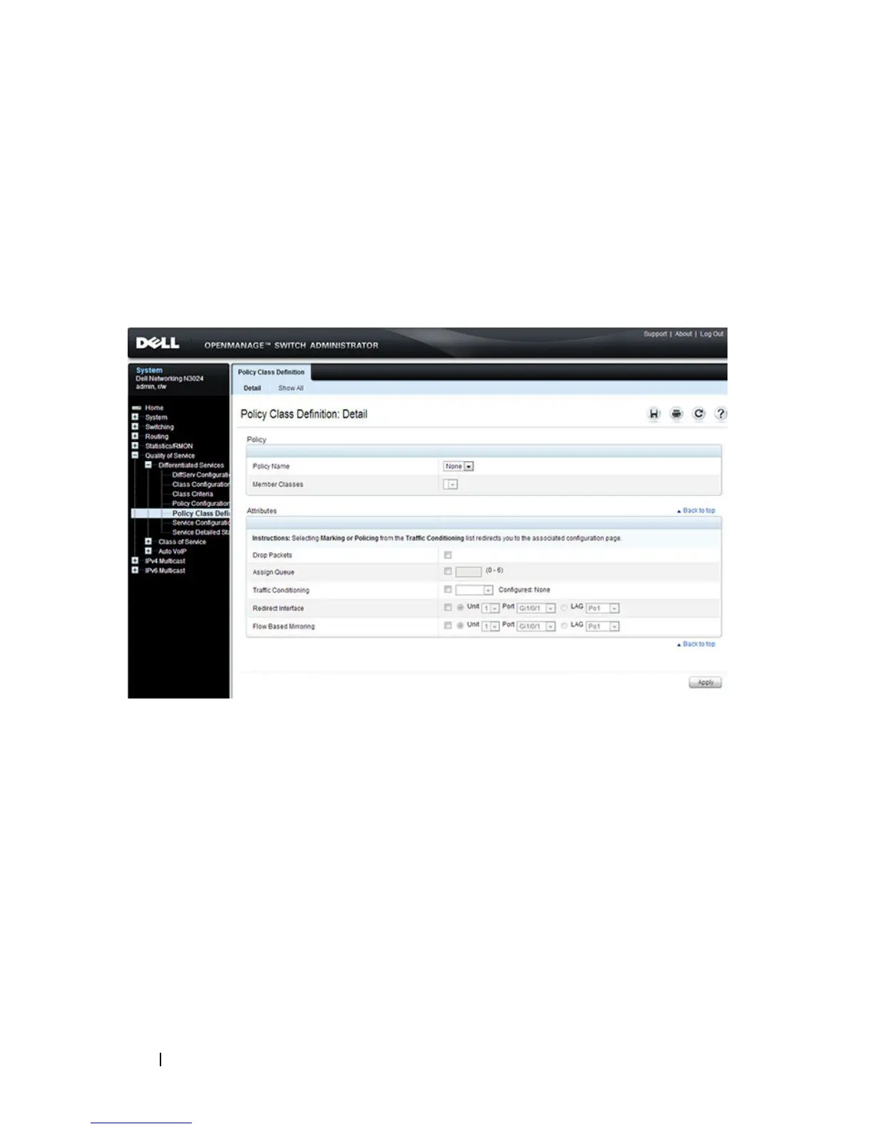 DiffServ Policy Class Definition page to associate a class to a policy,