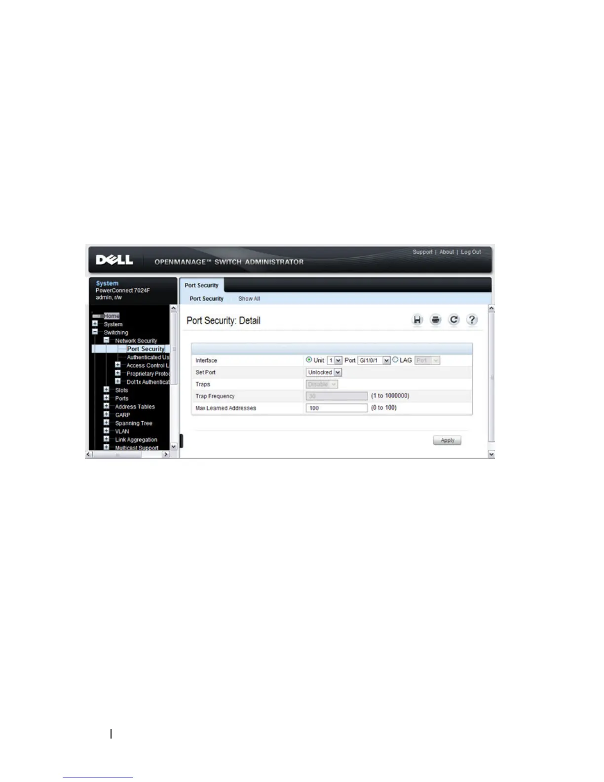 To display the Port Security page, click Switching