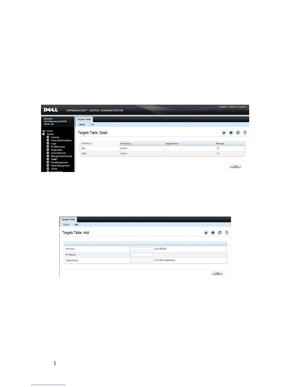 Use the Targets Table page to view and configure iSCSI targets on the switch.