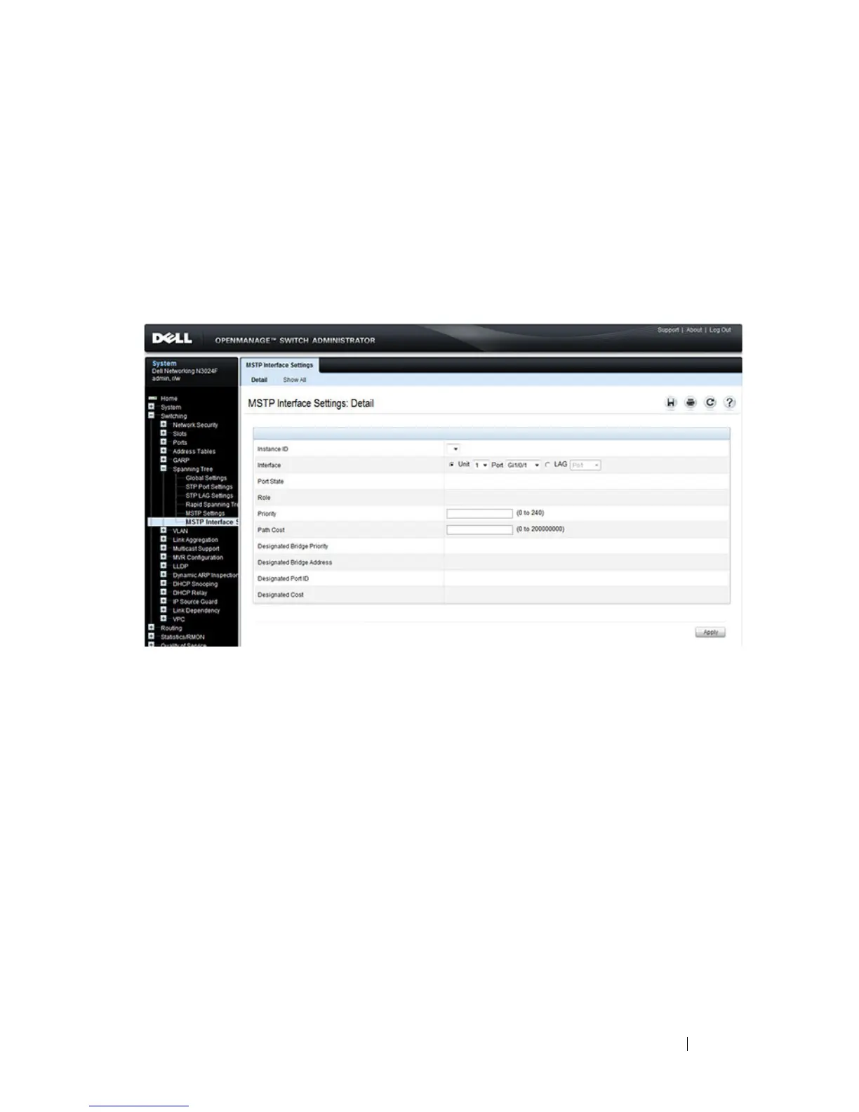 Use the MSTP Interface Settings page to assign MSTP settings to specific