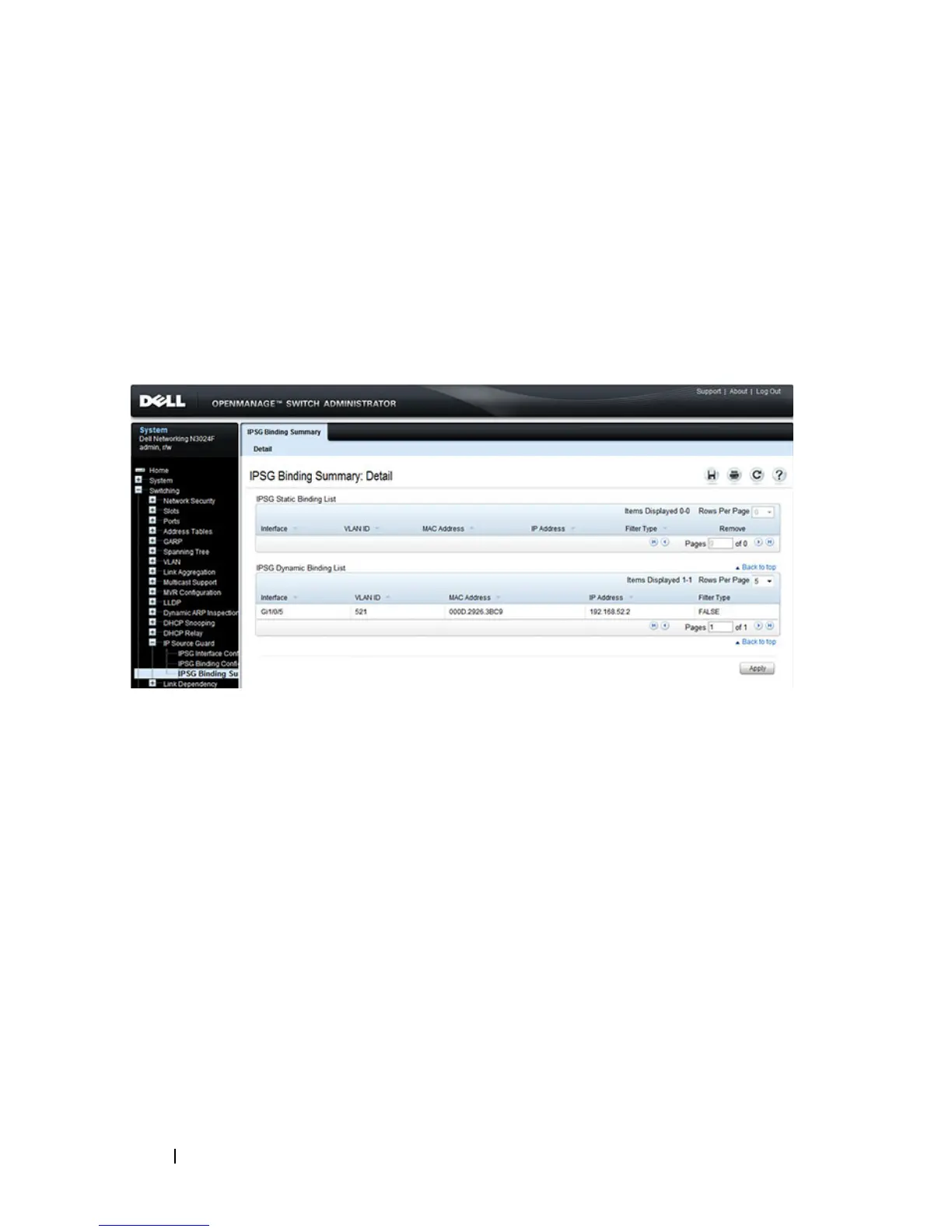 The IPSG Binding Summary page displays the IPSG Static binding list and