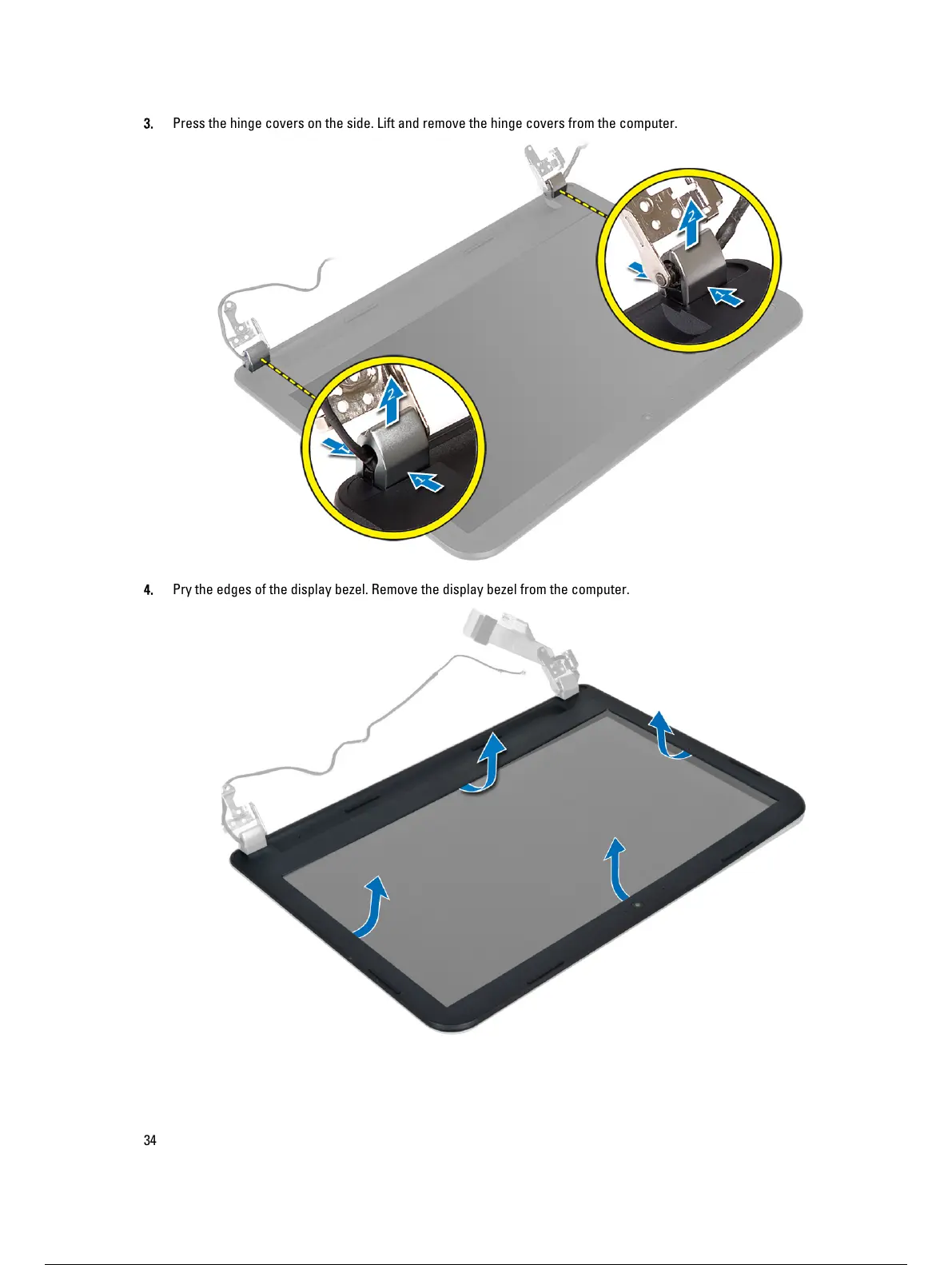 3. Press the hinge covers on the side. Lift and remove the hinge covers from the computer.