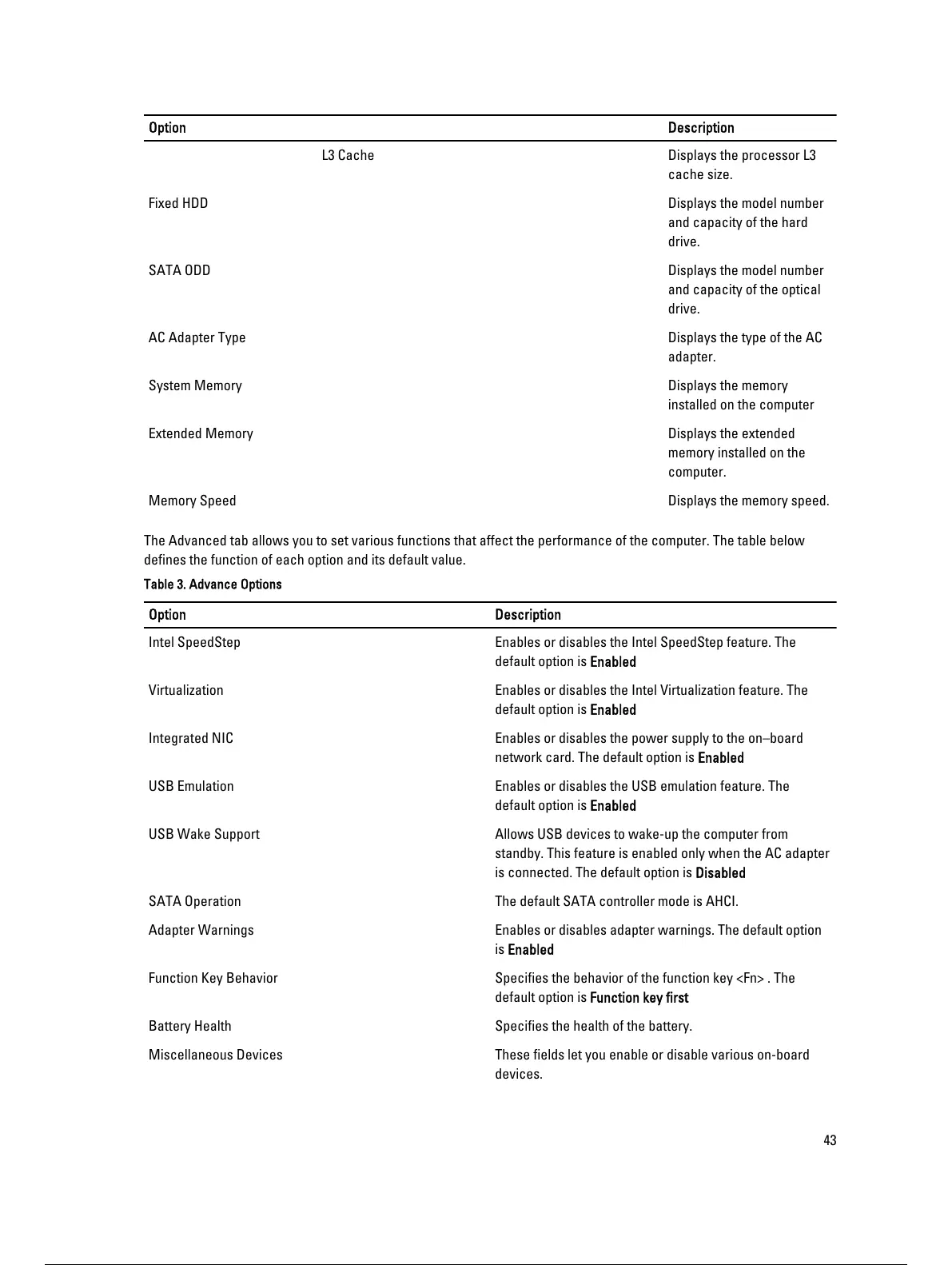The Advanced tab allows you to set various functions that affect the performance of the computer. The table below