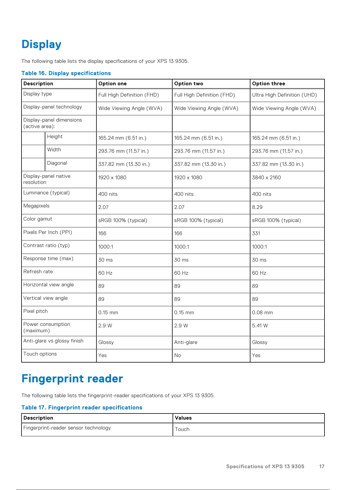 Table 16. Display specifications