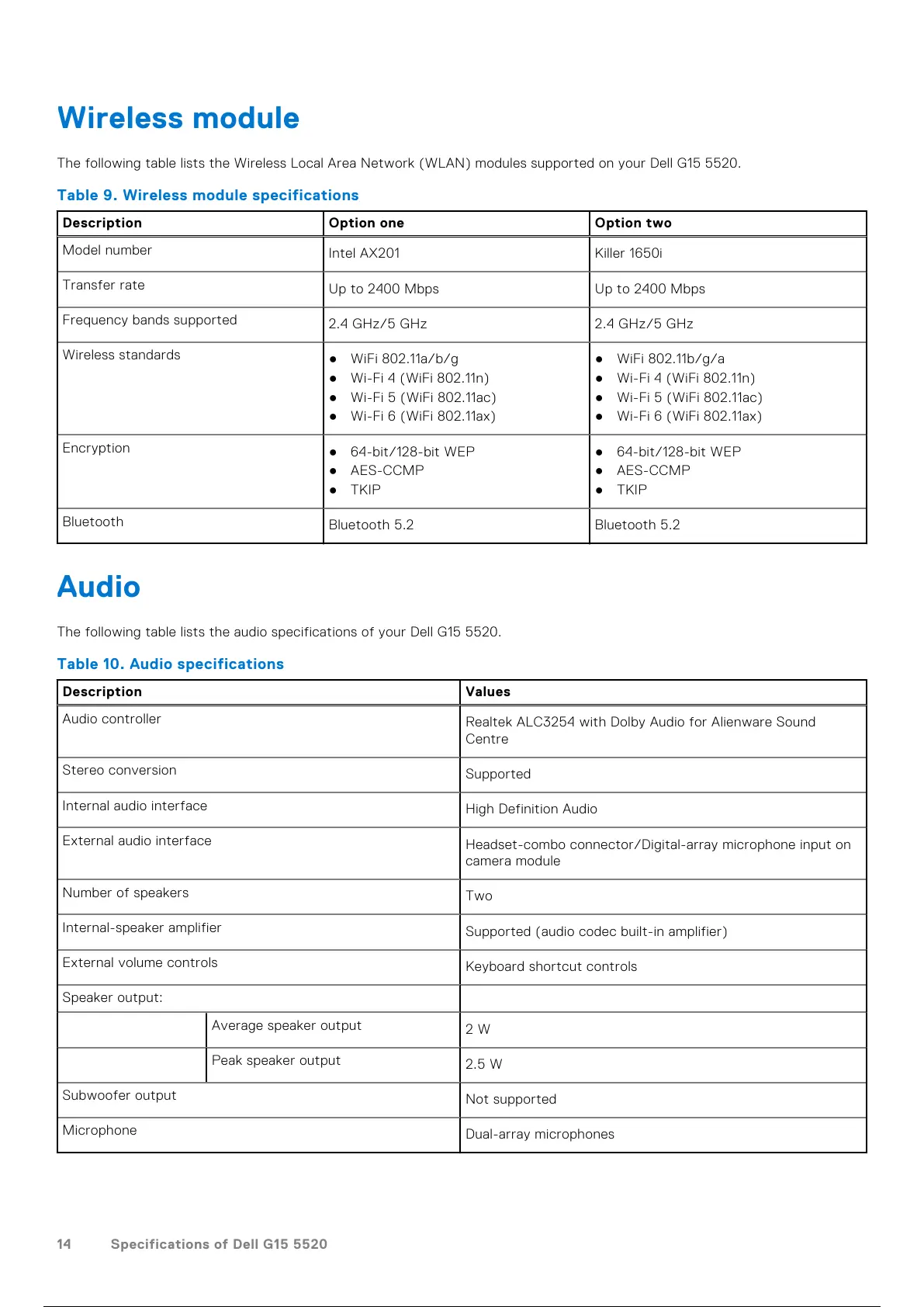 The following table lists the Wireless Local Area Network (WLAN) modules supported on your Dell G15 5520.