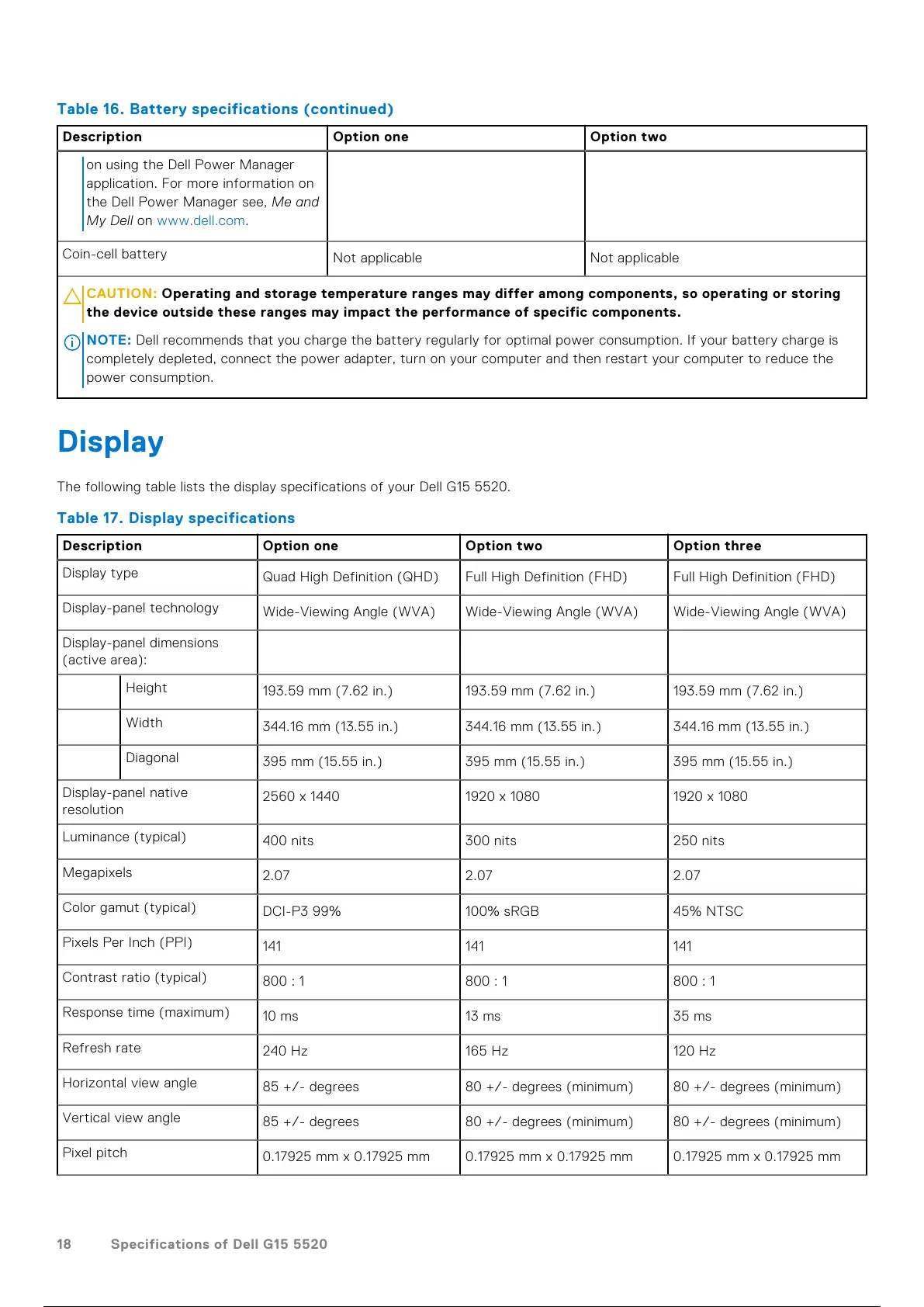 The following table lists the display specifications of your Dell G15 5520.