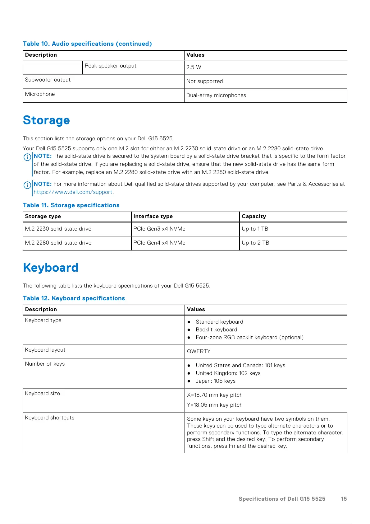 The following table lists the keyboard specifications of your Dell G15 5525.
