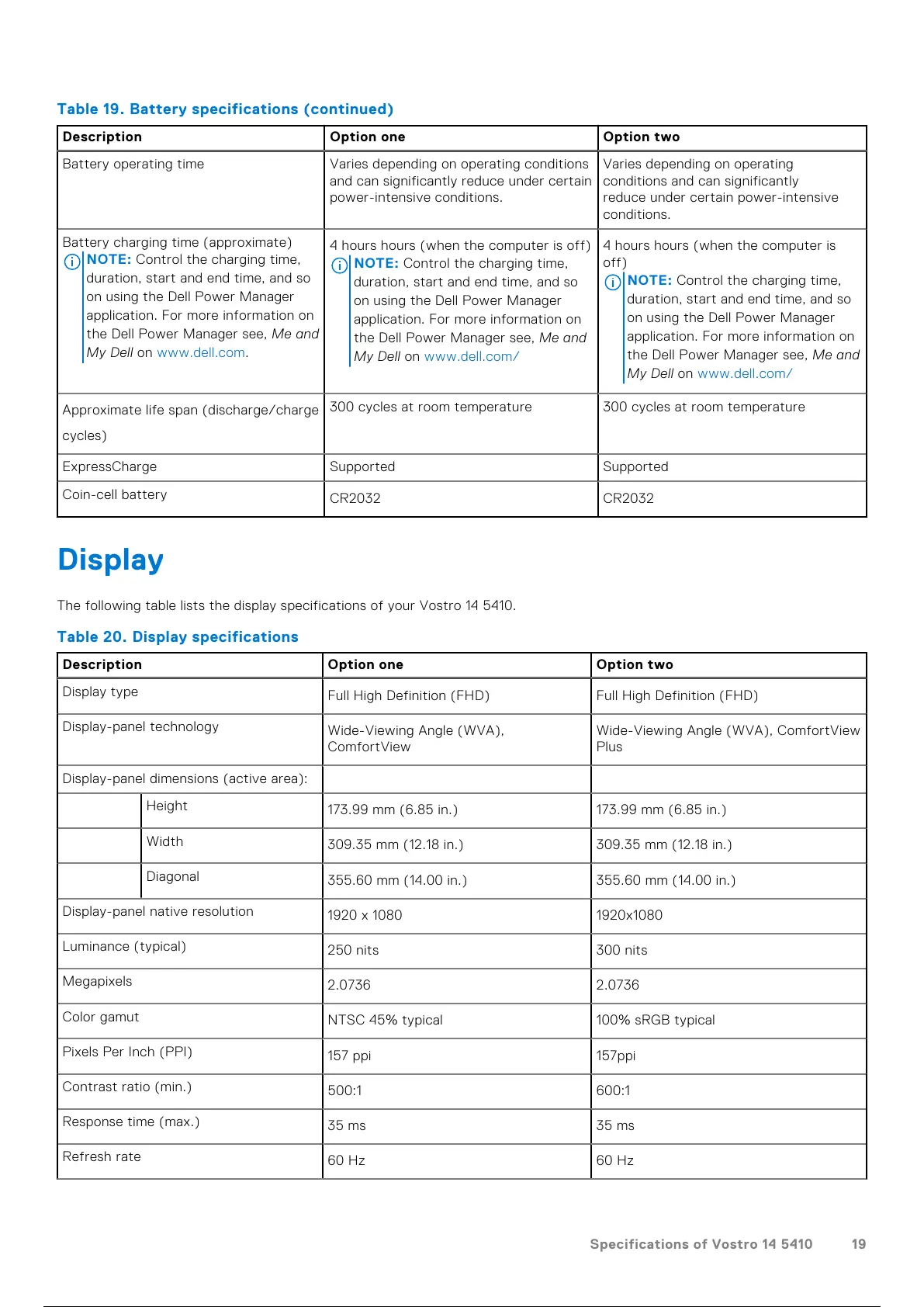 Table 20. Display specifications