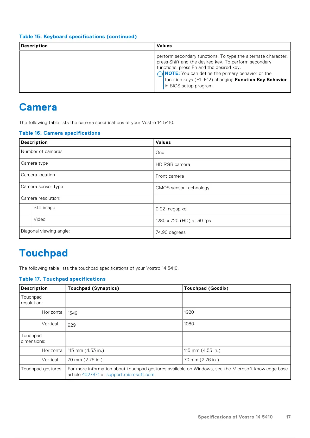 The following table lists the touchpad specifications of your Vostro 14 5410.