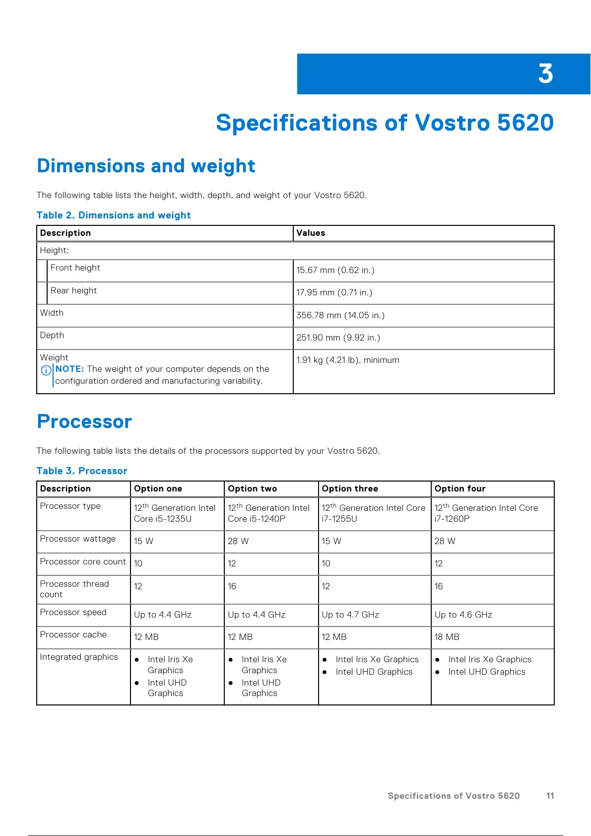 Specifications of Vostro 5620 11
