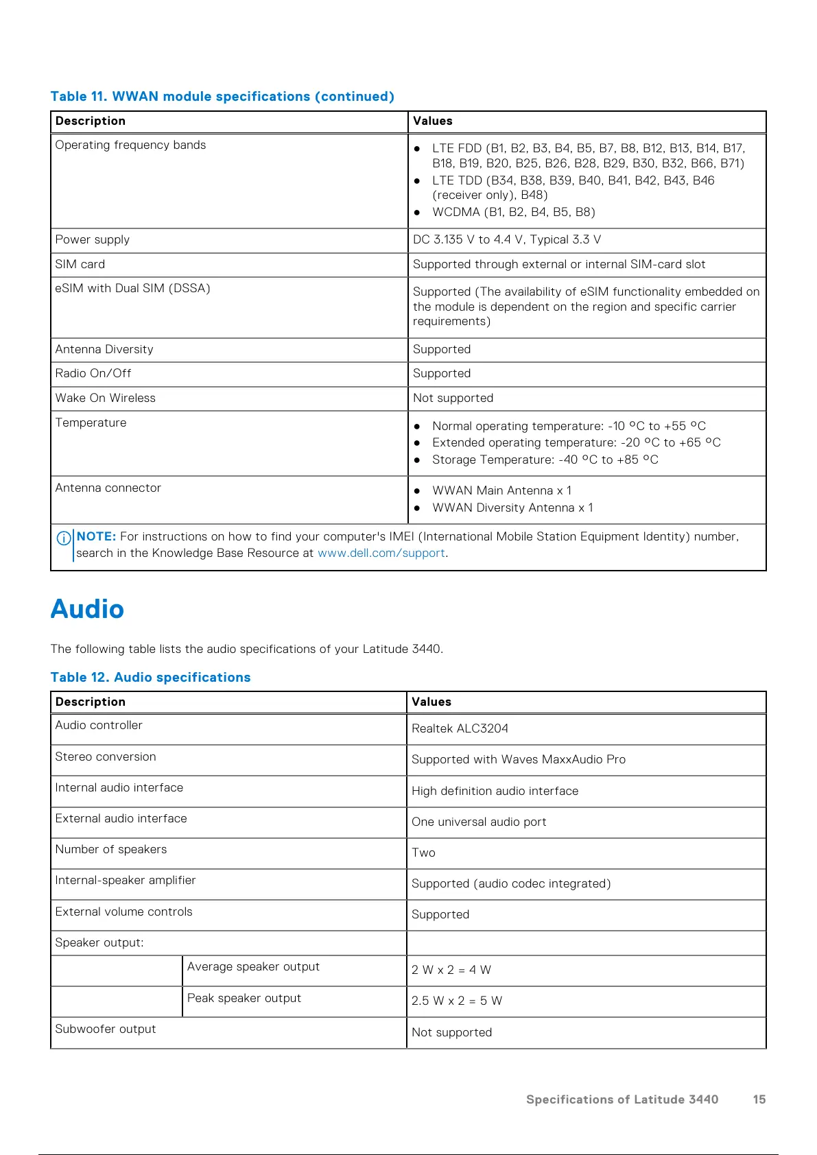 The following table lists the audio specifications of your Latitude 3440.