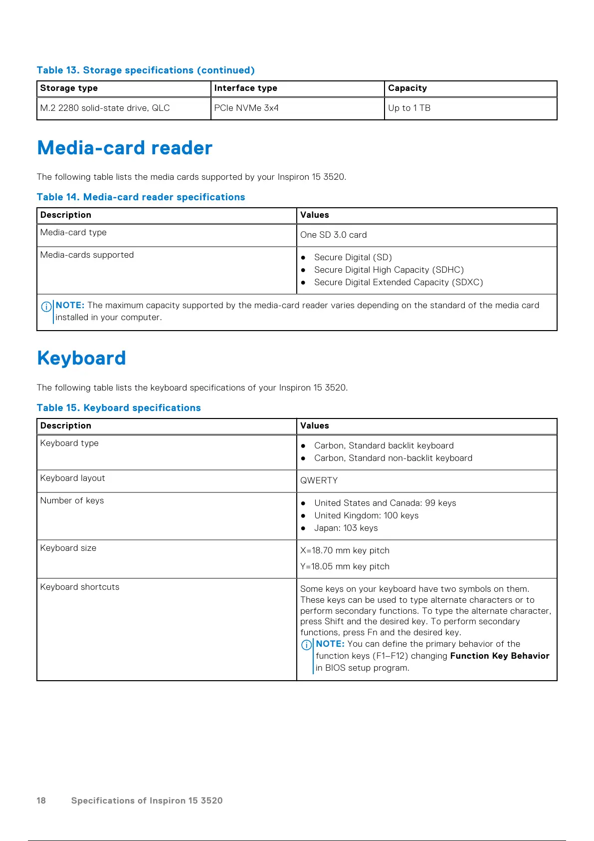 The following table lists the keyboard specifications of your Inspiron 15 3520.