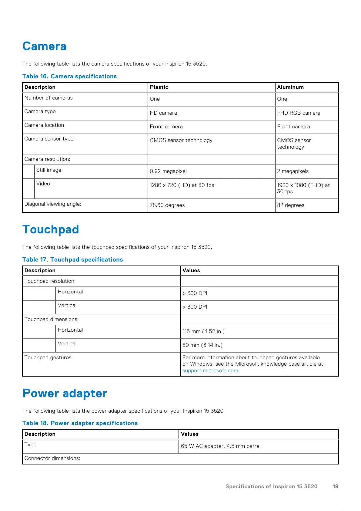 The following table lists the camera specifications of your Inspiron 15 3520.