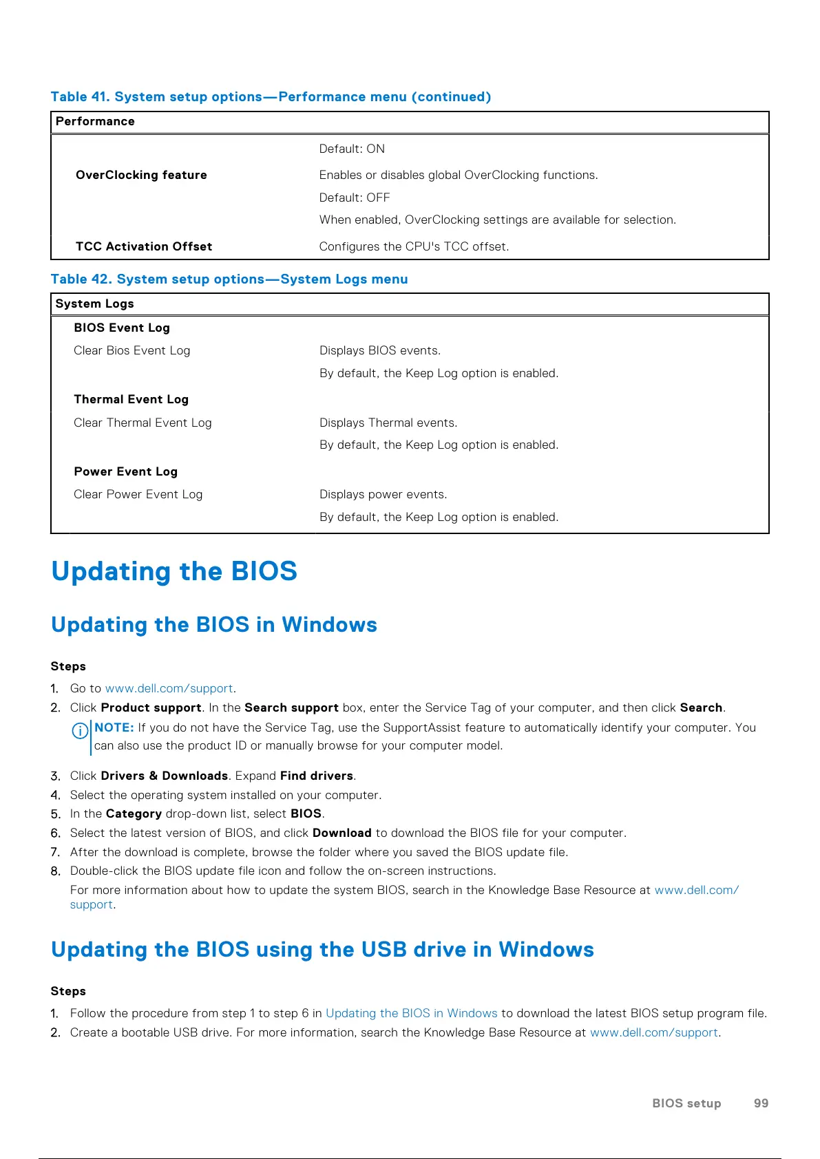 Table 42. System setup options—System Logs menu