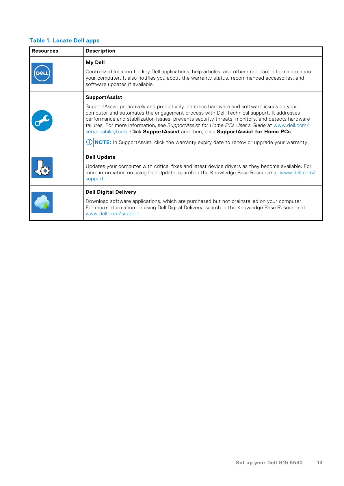 Table 1. Locate Dell apps