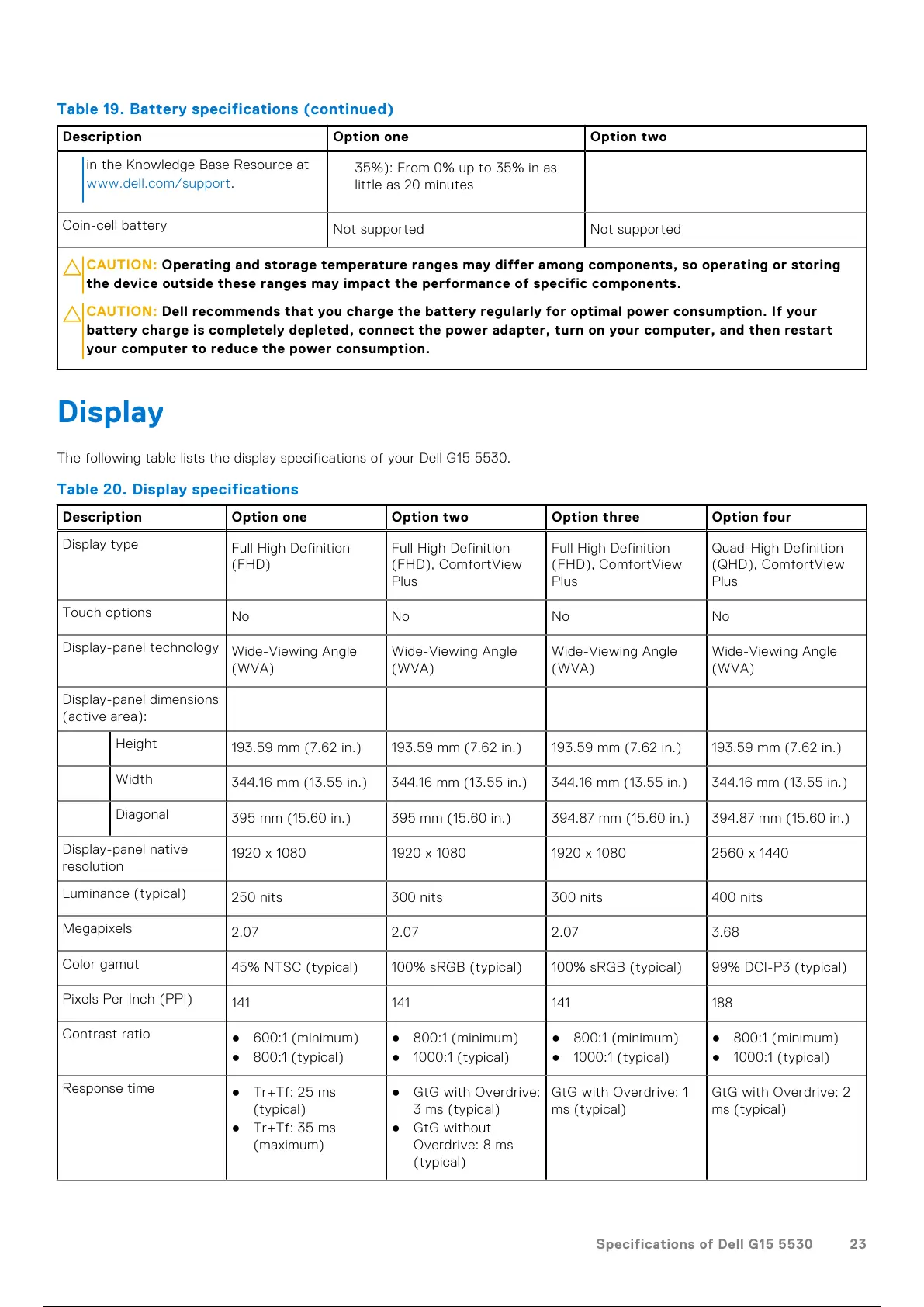 The following table lists the display specifications of your Dell G15 5530.