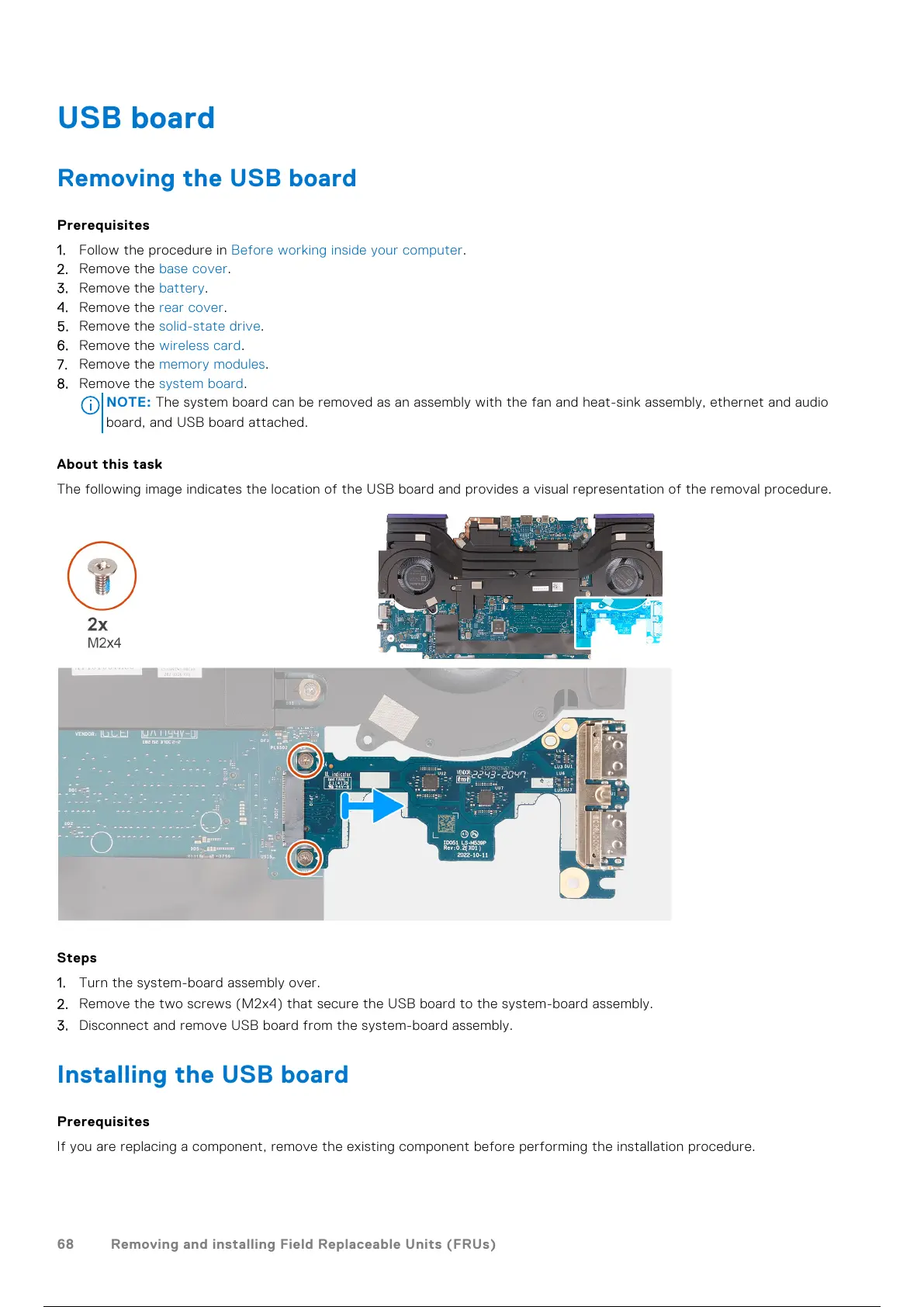 2. Remove the two screws (M2x4) that secure the USB board to the system-board assembly.