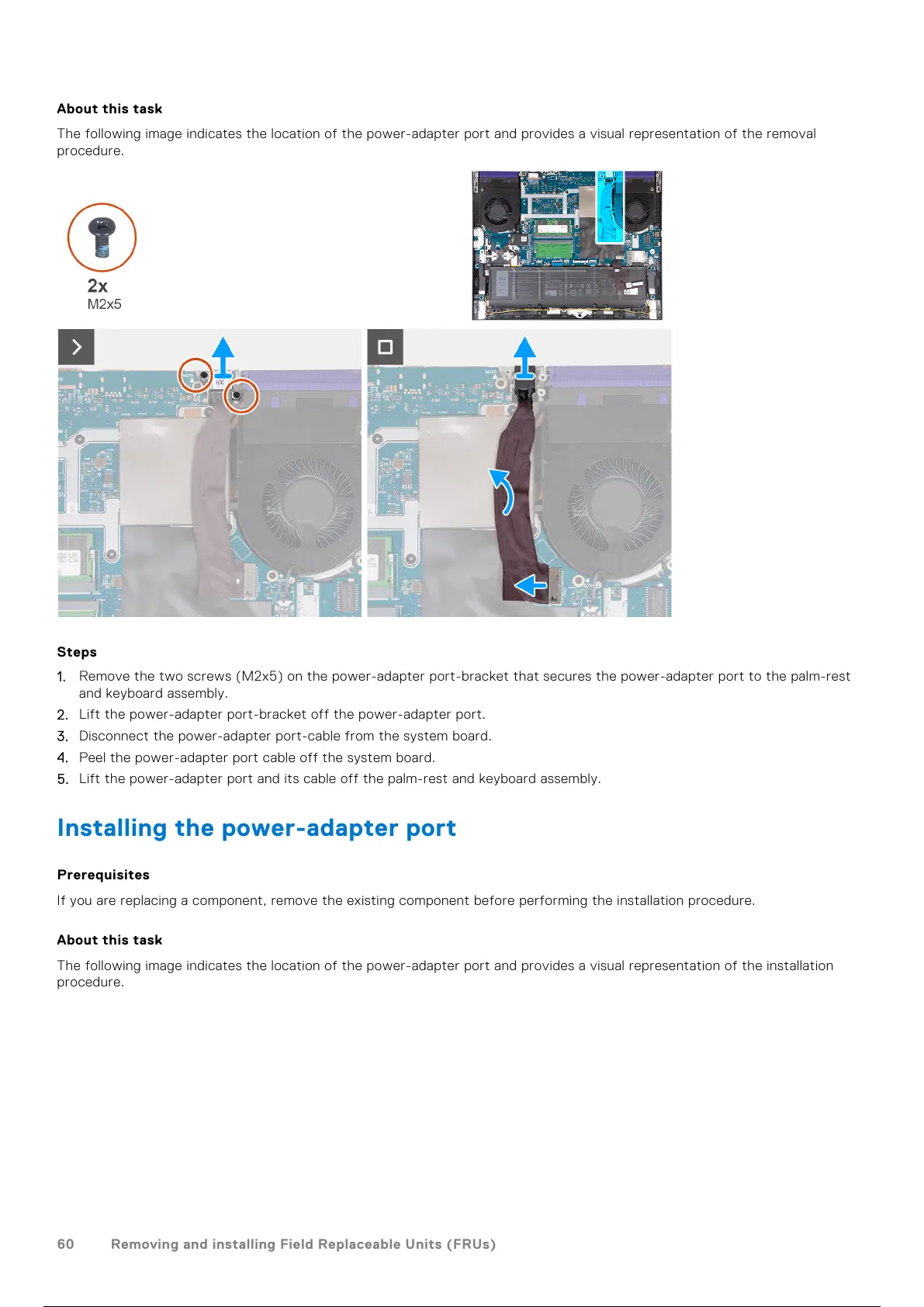 1. Remove the two screws (M2x5) on the power-adapter port-bracket that secures the power-adapter port to the palm-rest
