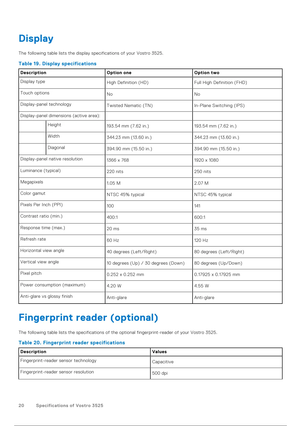 The following table lists the display specifications of your Vostro 3525.