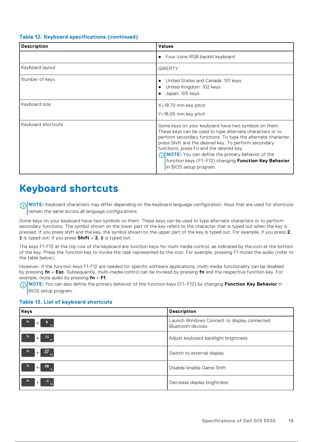 Table 12. Keyboard specifications(continued)