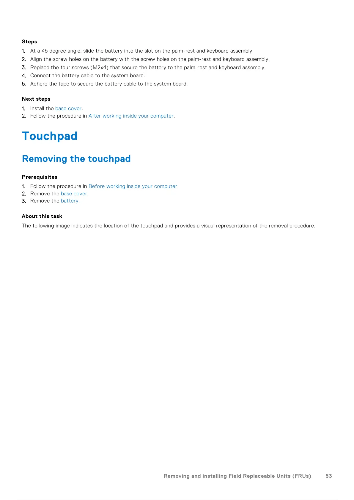 3. Replace the four screws (M2x4) that secure the battery to the palm-rest and keyboard assembly.