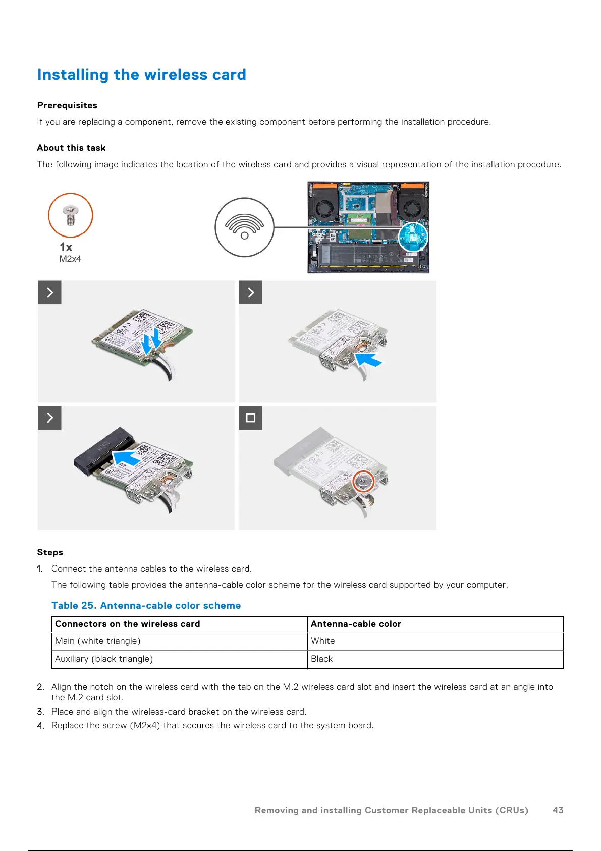 The following table provides the antenna-cable color scheme for the wireless card supported by your computer.