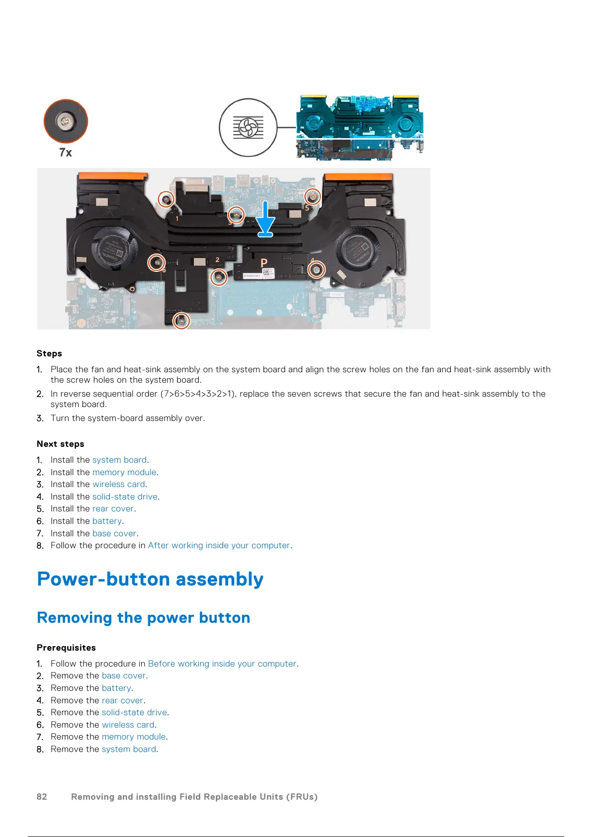 2. In reverse sequential order (7>6>5>4>3>2>1), replace the seven screws that secure the fan and heat-sink assembly to the