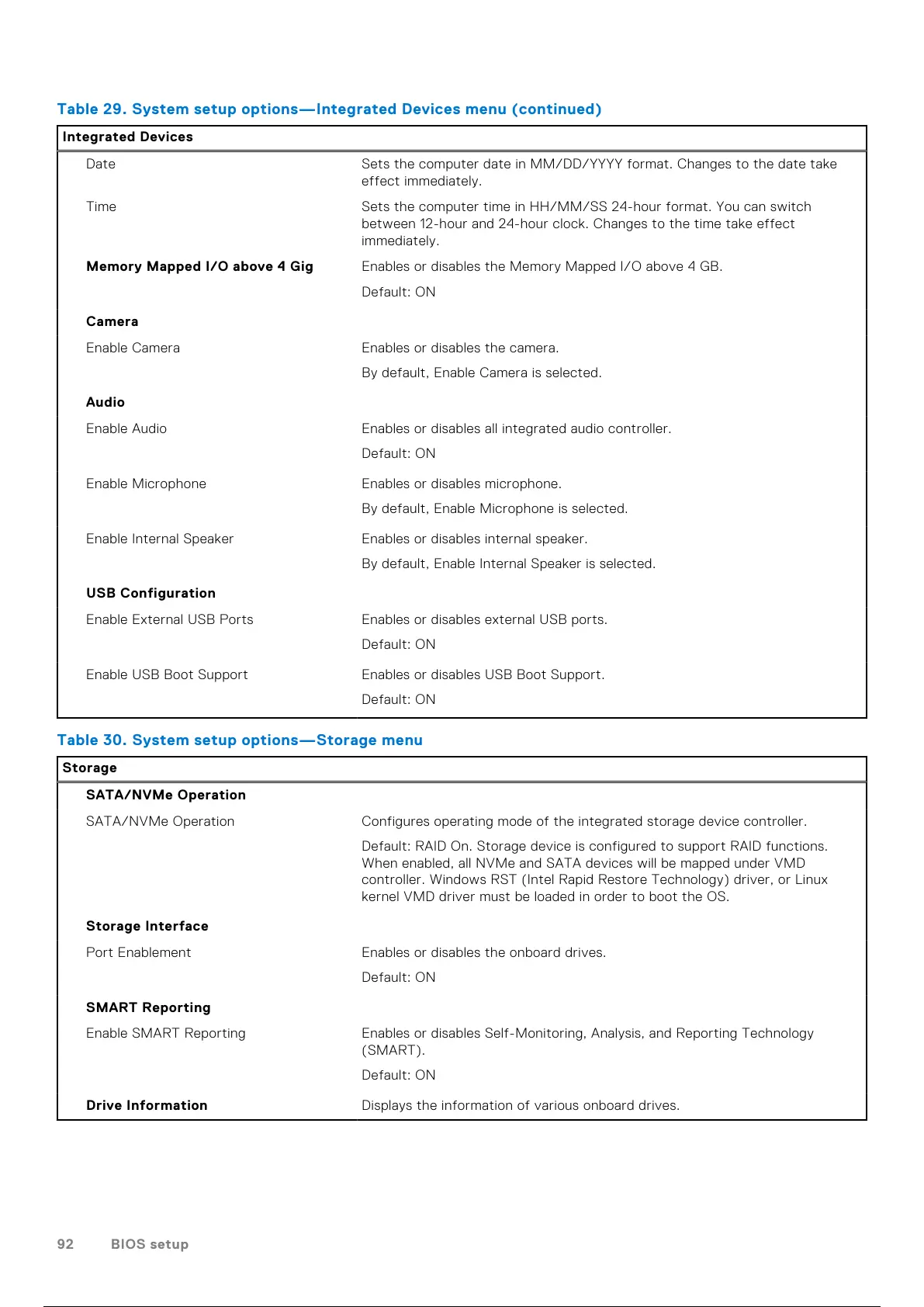 Table 30. System setup options—Storage menu