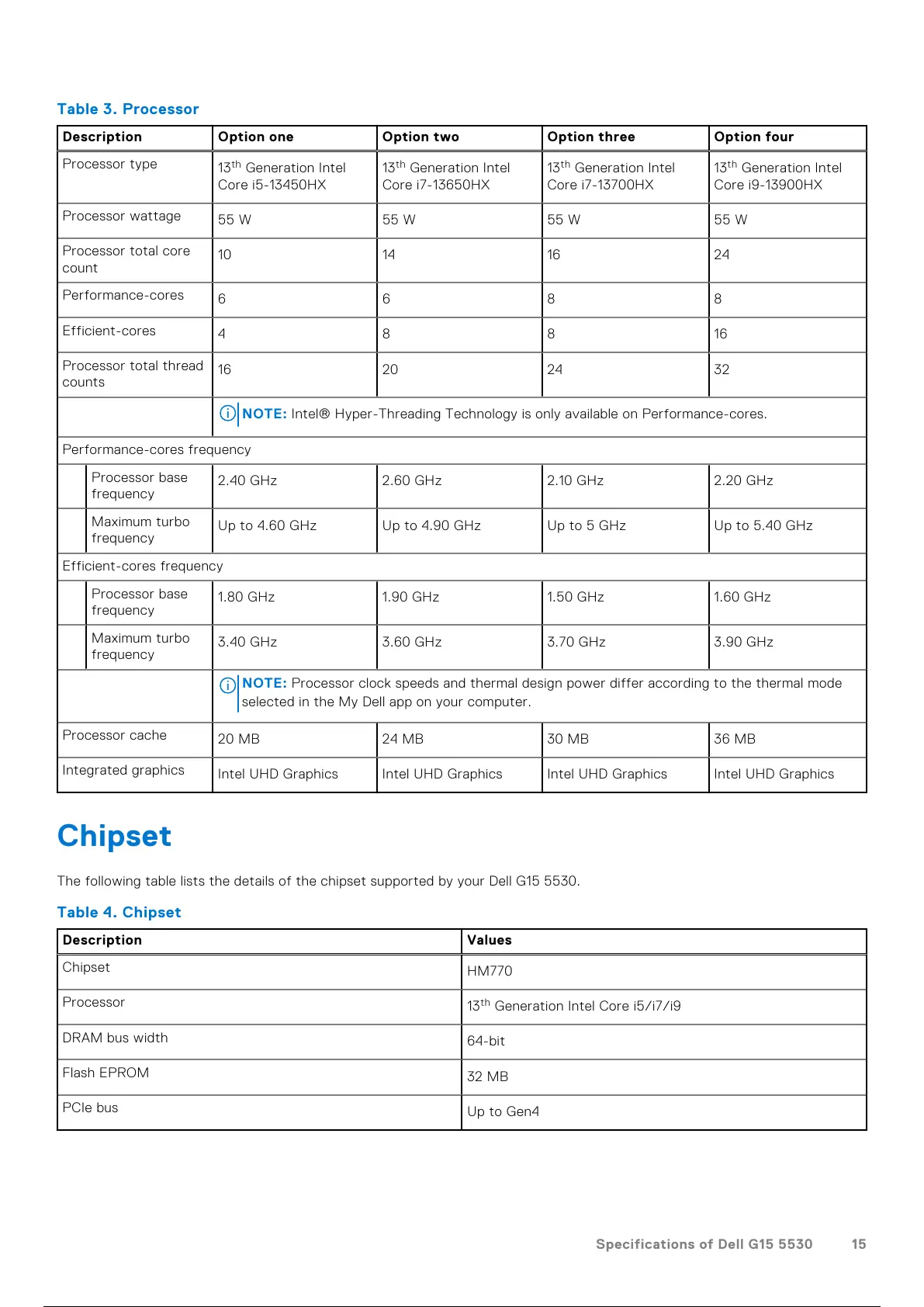 The following table lists the details of the chipset supported by your Dell G15 5530.