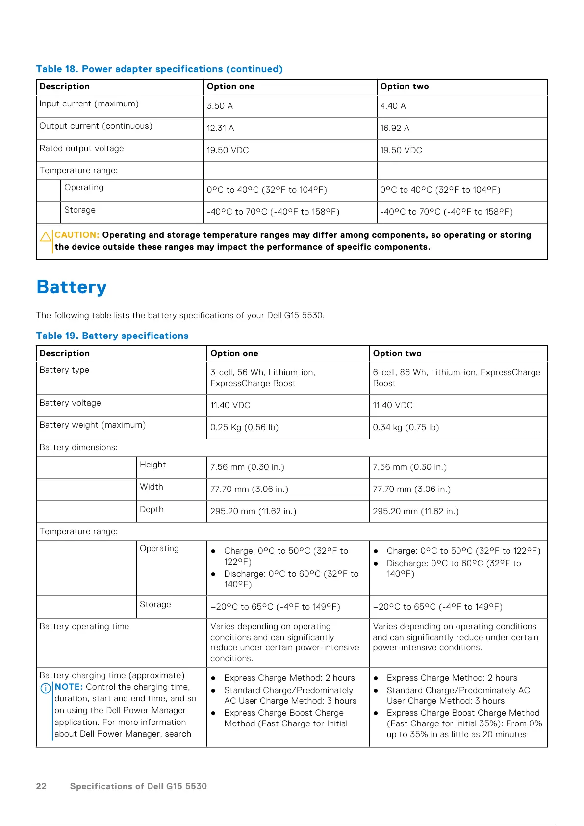 Table 19. Battery specifications