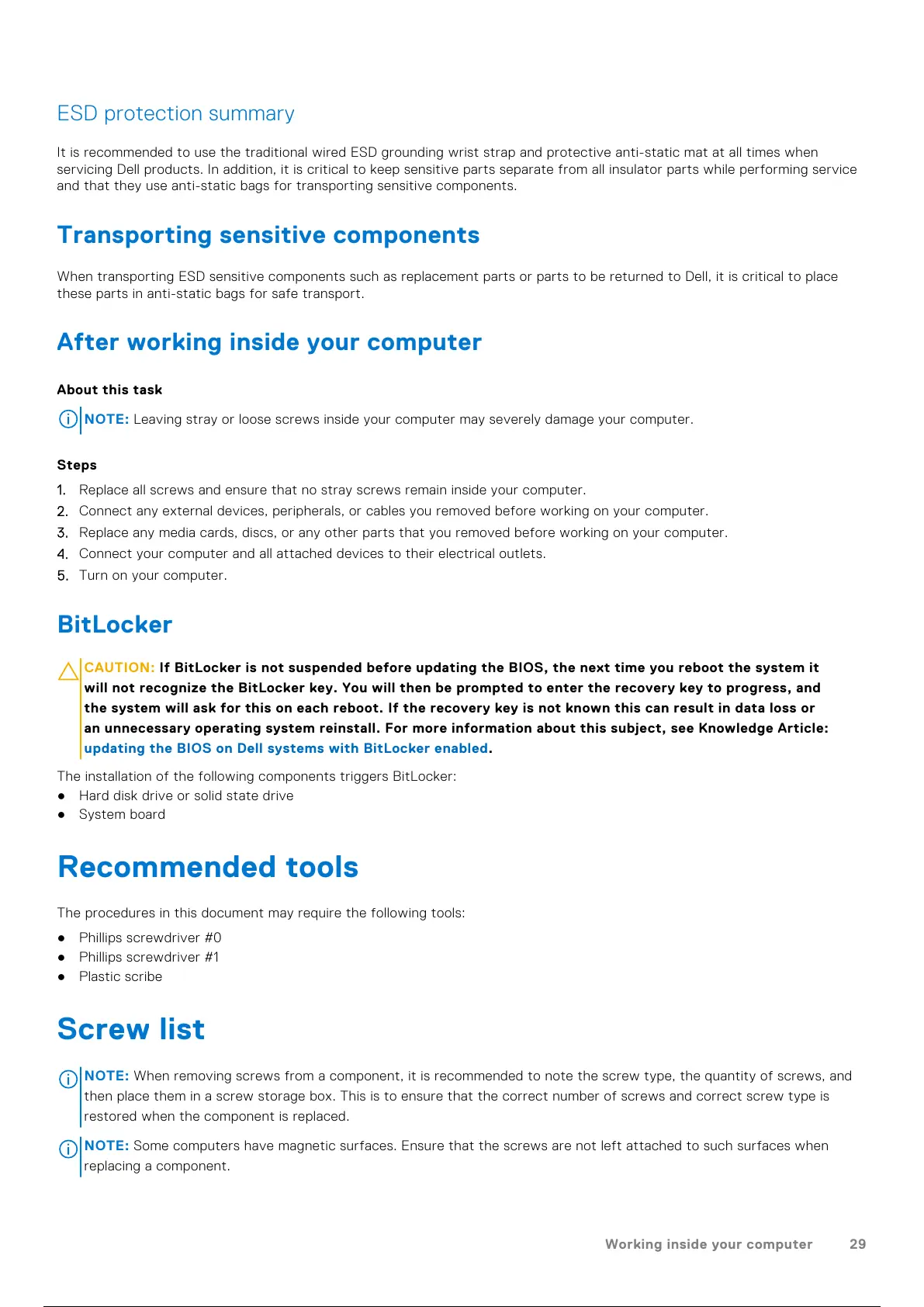 Dell NOT22107 - Transporting Sensitive Components; After Working Inside Your Computer; Bitlocker; Recommended Tools