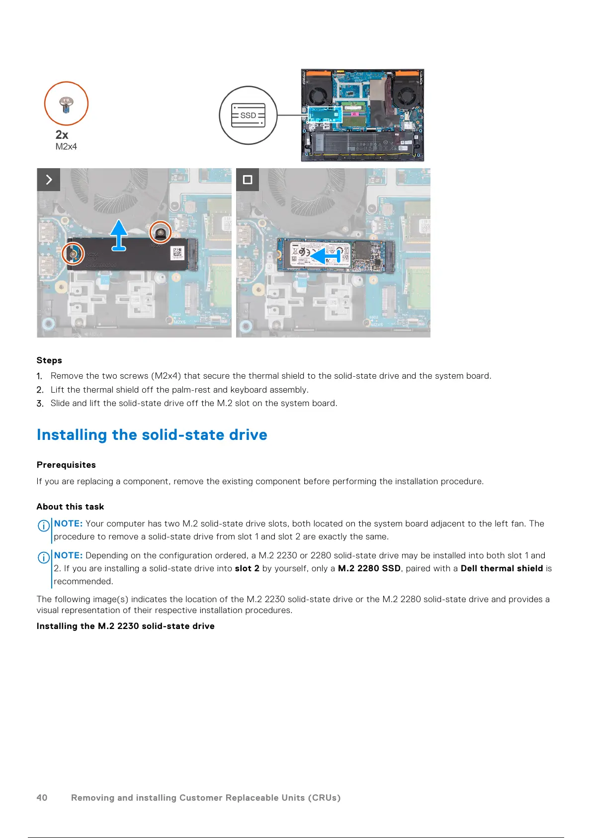 2. If you are installing a solid-state drive into slot 2 by yourself, only a M.2 2280 SSD, paired with a Dell thermal shield is
